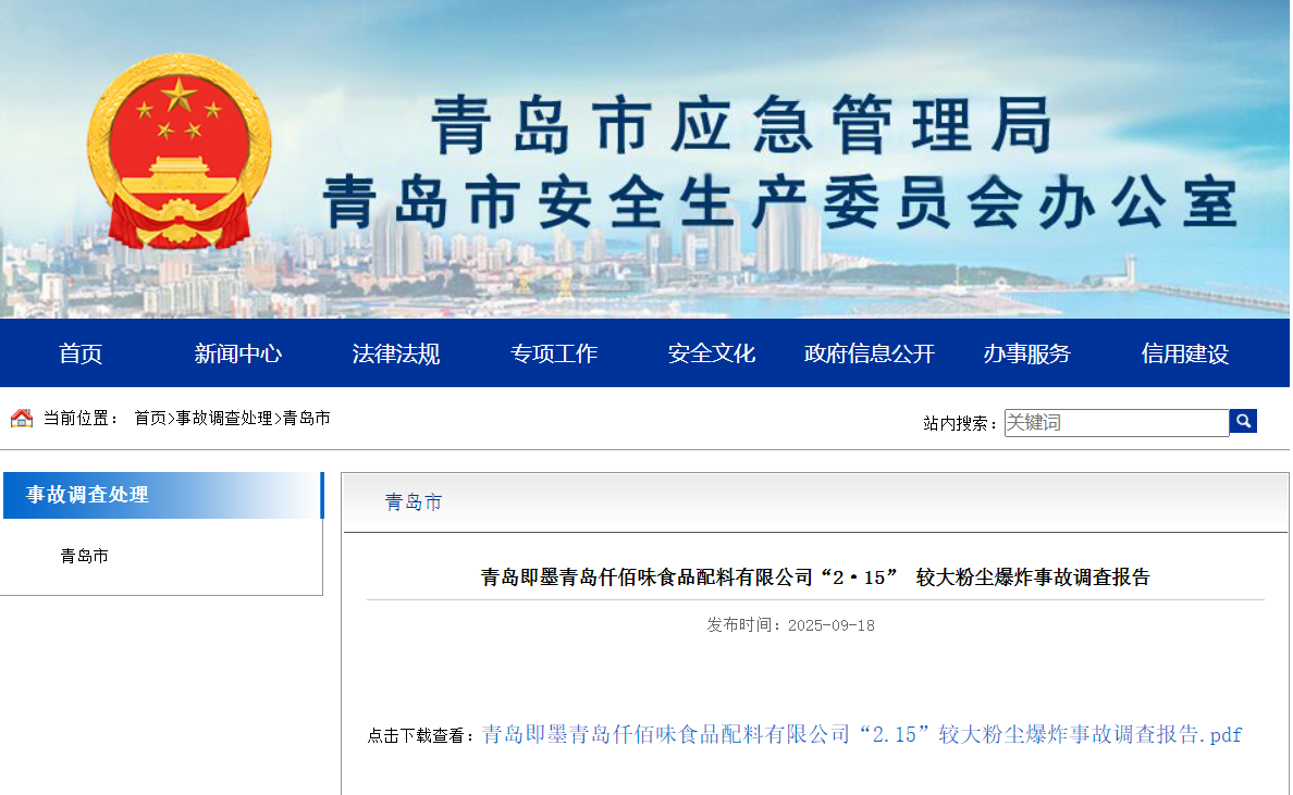 2025年2月15日13时6分许,山东青岛市即墨区青岛仟佰味食品配料有限公司发生一起较大粉尘爆炸事故,造成5人死亡,直接经济损失约840万元。