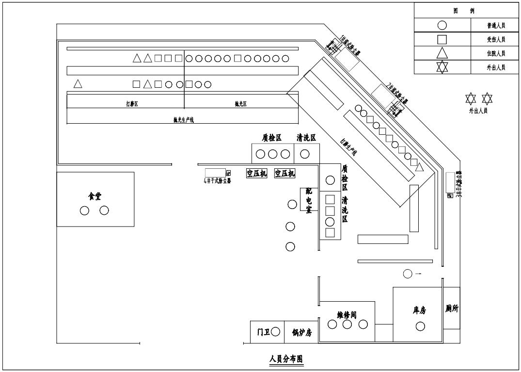 事故车间为汽车轮毂打磨车间,分为抛光生产线、打磨生产线、质检区、清洗区等。抛光生产线沿车间横向布局、打磨生产线沿车间斜向布局(见图2),总工位98个。该车间生产工艺设计、布局与设备选型均由华川公司自行完成,打磨抛光均为人工作业。